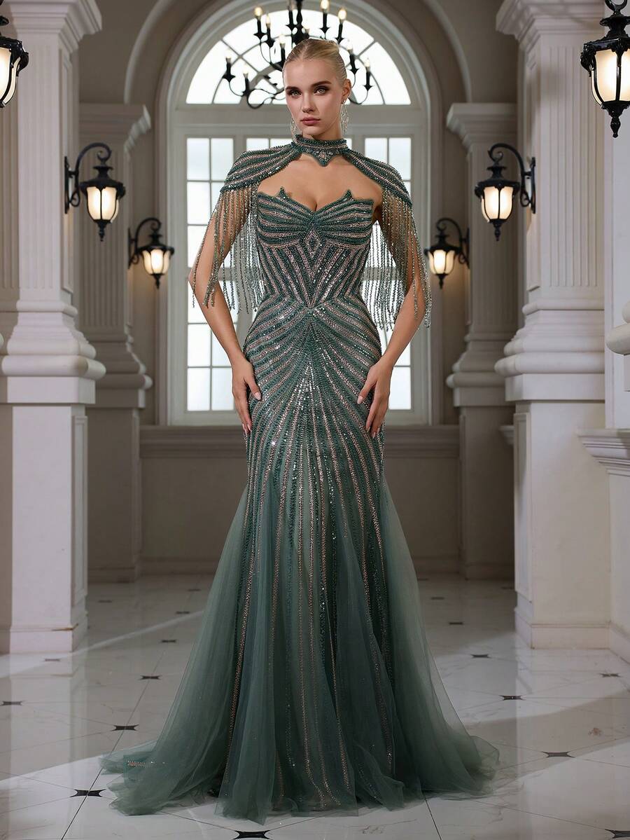 Shiny Zipper Backless Elegant Tassel Beaded Embroidered Sexy Halter Tie Waist Mermaid Evening Dress, Suitable For Wedding, Banquet, Party