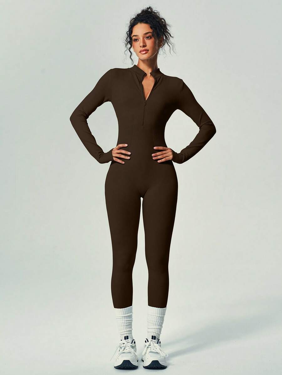UONNOU 1 Piece Jumpsuit One-Piece Sportswear Peach Hip Lift Waist Control Abdomen Slim Leg Full Body Shaping Zipper Half-Opening Long Sleeve Thumb Hole Design Small Stand-Up Collar Suitable For Sports Skiing Cycling Gym Yoga Ball Sports Exercise Indoor And Outdoor Daily Leisure Seamless Ribbed Knitted Fabric Sportswear Autumn And Winter Style