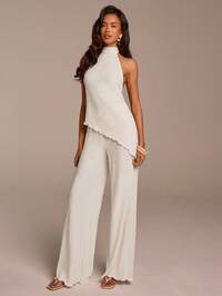 COSMINACOSMINA Women's Elegant Halter Sleeveless Textured 2-Piece Set, Wide Leg Bohemian Style, Apricot Color, Versatile For Commute, Office, Daily, Date, Valentine's Day, Wedding Guest, Wide Leg Pants Set, Two Piece Pant Set, Pant Suit Summer Sets, Ribbed Two Piece Set, Knitted Two Piece Outfit #3 Bestseller