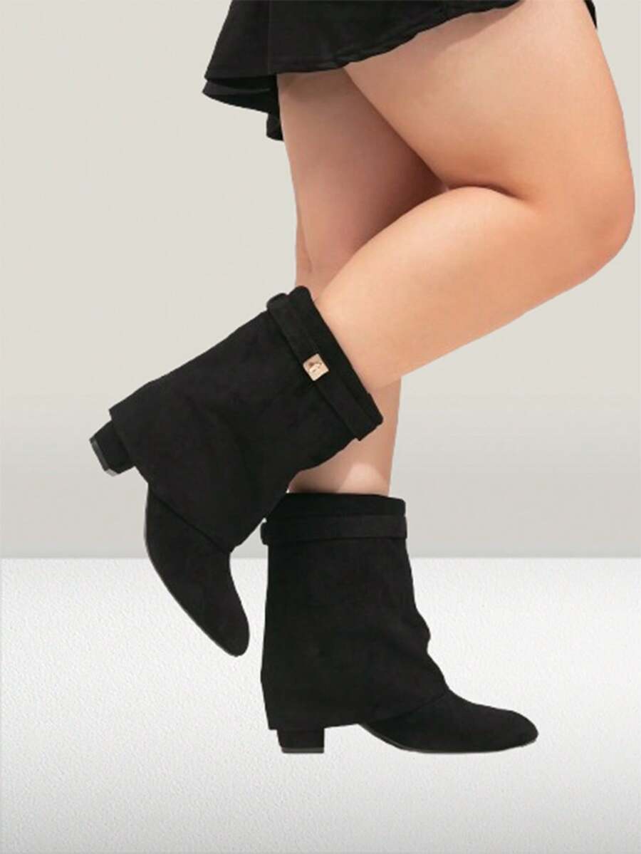 Women's Fashion Wide Width Faux Leather Tall Boots, Holiday Vacation Atmosphere, Folding Shaft, Chunky Heel, Black High Heel Ankle Boots, Sexy Outdoor Tall Boots, Wide Width High Heel Boots, Wide Calf Boots