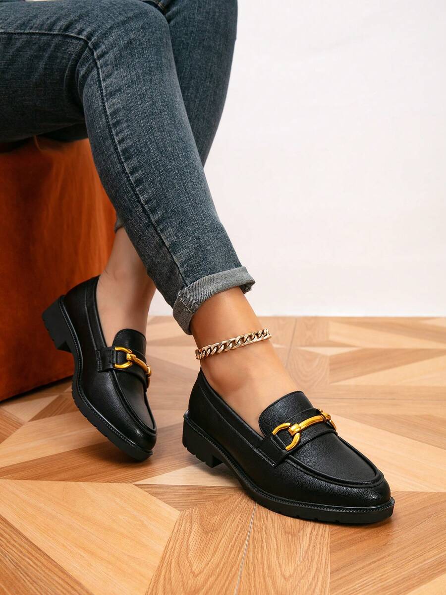 Women's Loafers, Round Toe Metal Buckle Flat Loafers, Outdoor Retro Women's Shoes, Flat Brogues, Women's Shoes, Women's Casual Shoes, Black Shoes