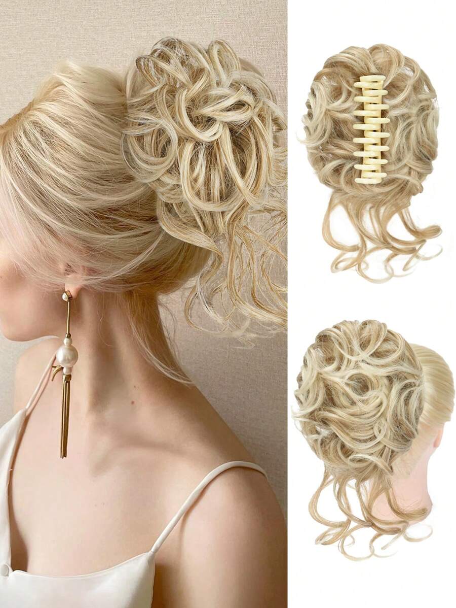 • Women's Messy Bun Hair Clip, Messy Wavy Curly Hair Bun Extension, Fluffy Updo Hair Bun Clip-In Synthetic Hair Ponytail Extension (Strawberry Blonde And Bleached Blonde Mix) - Champagne - View 11