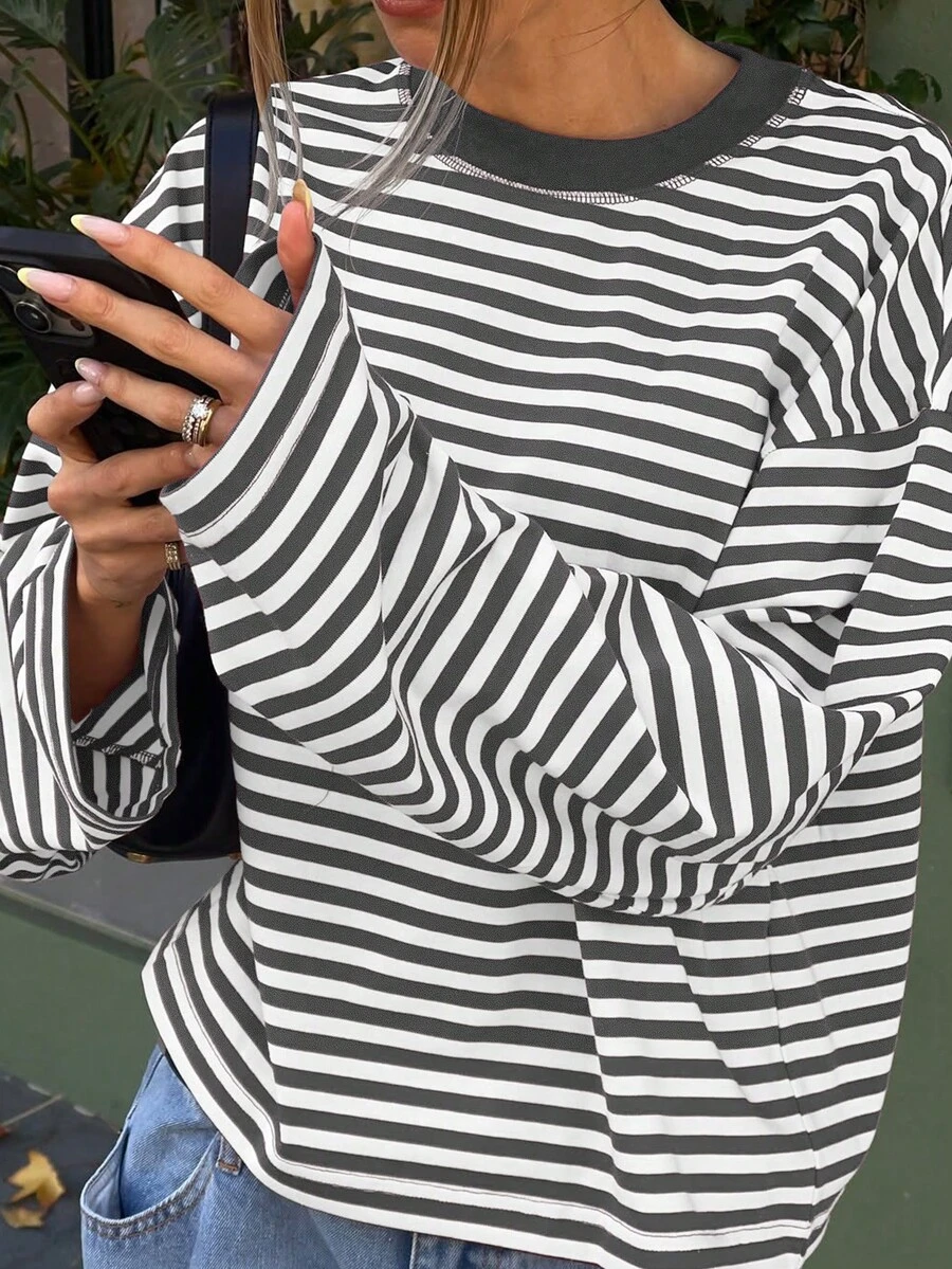 Women's Round Neck Drop Shoulder Long Sleeve Striped Contrast Ribbed Casual T-Shirt