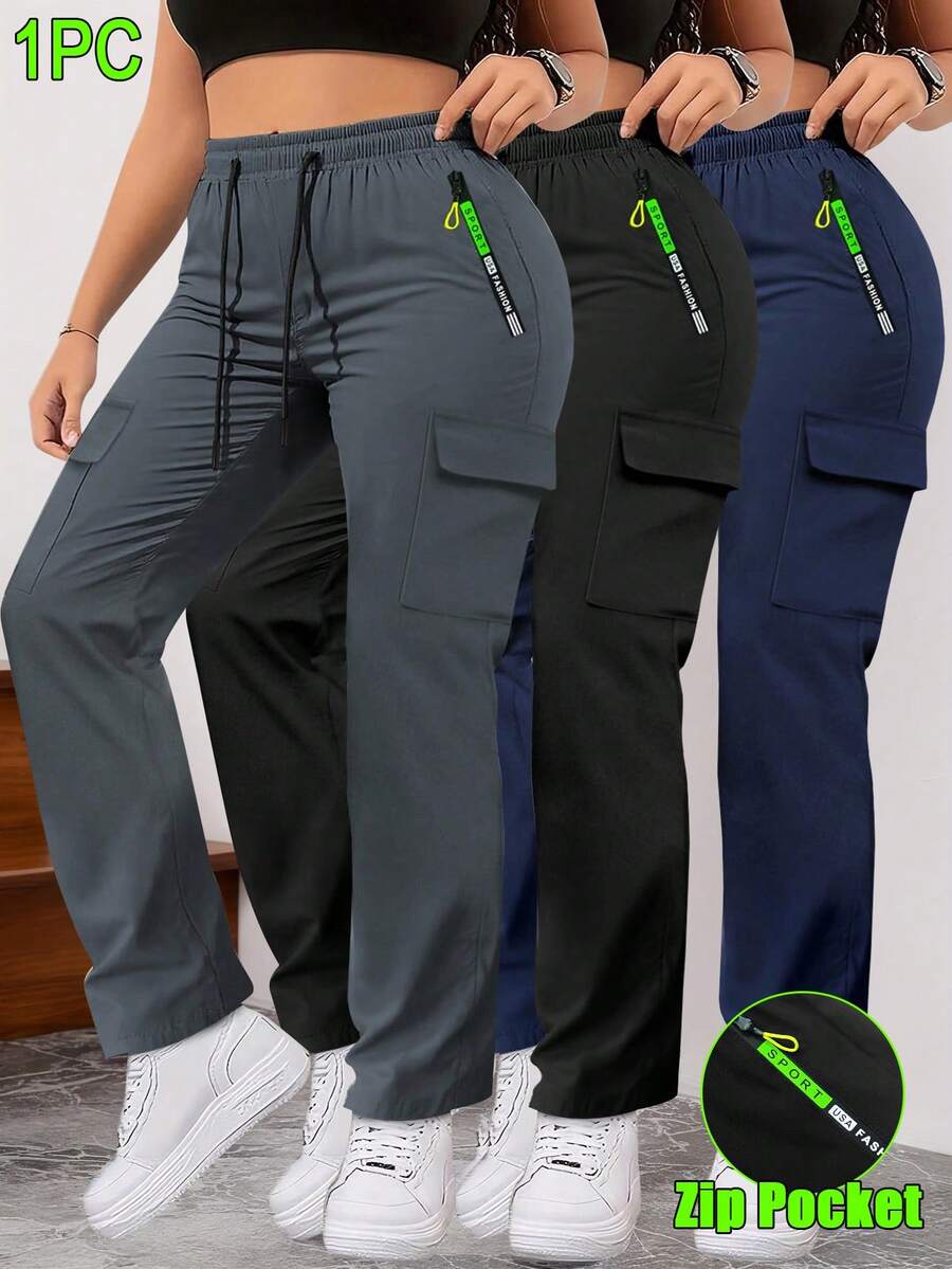 Women's Spring/Autumn Zipper Pocket Cargo Pants, Fashionable Large Pocket Design, Drawstring Elastic Waist, Casual Outdoor/Daily Wear Slim Fit Trousers