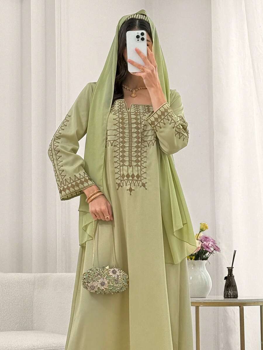 Yasmyna Elegant Embroidered Loose Long Sleeve Robe With Headscarf